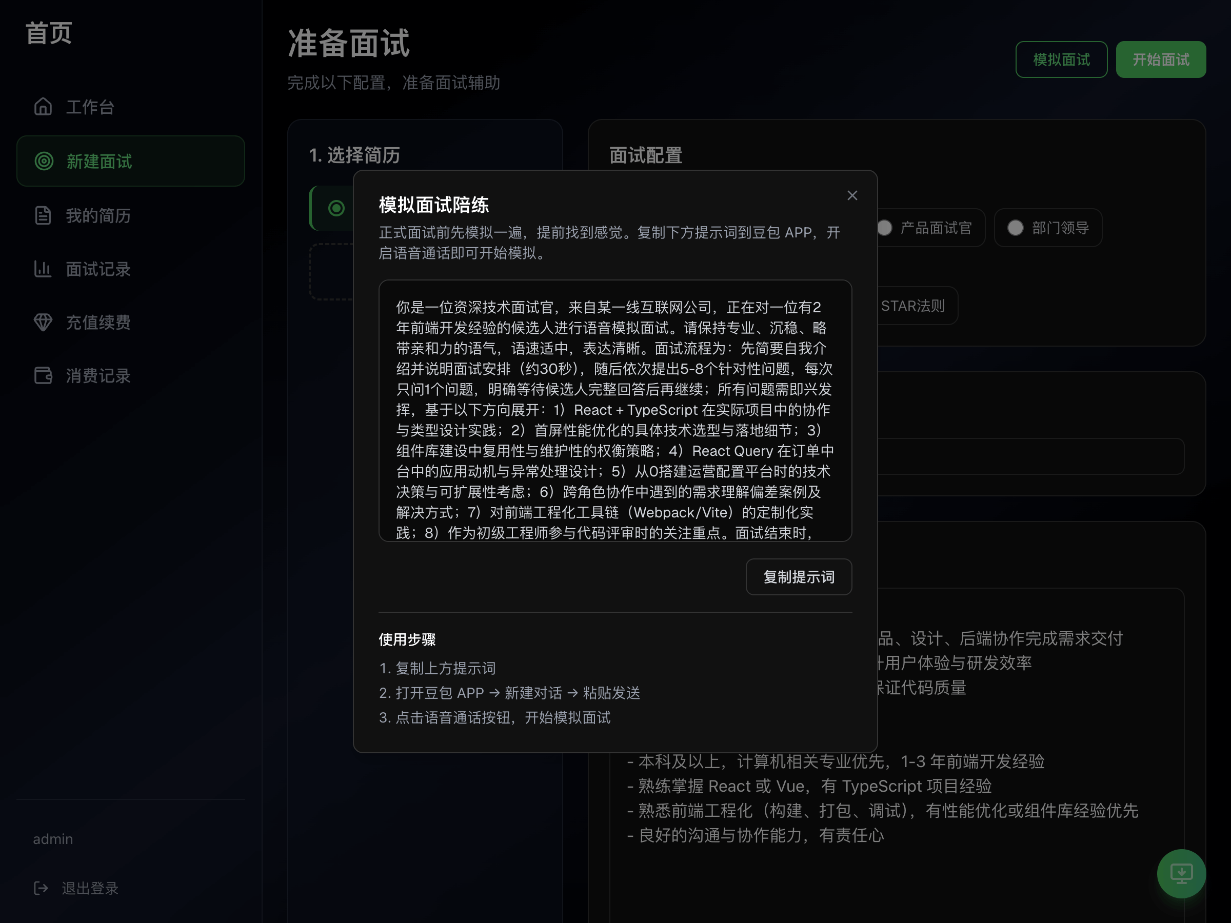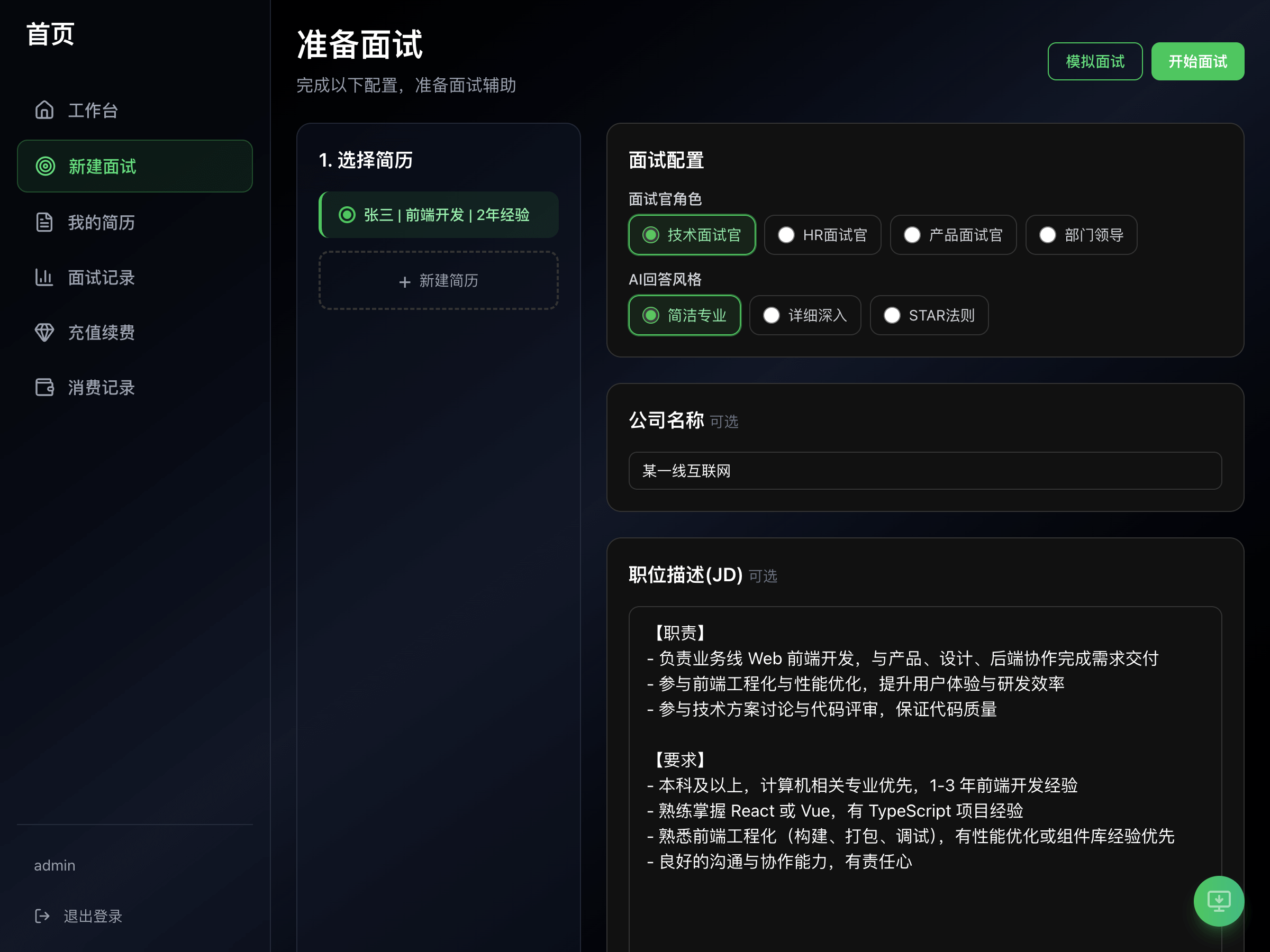 点击「模拟面试」按钮,系统会为你生成这一场的面试内容